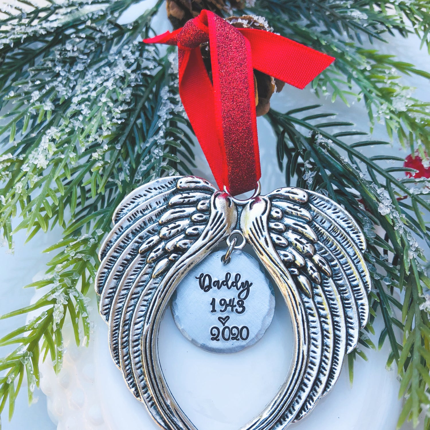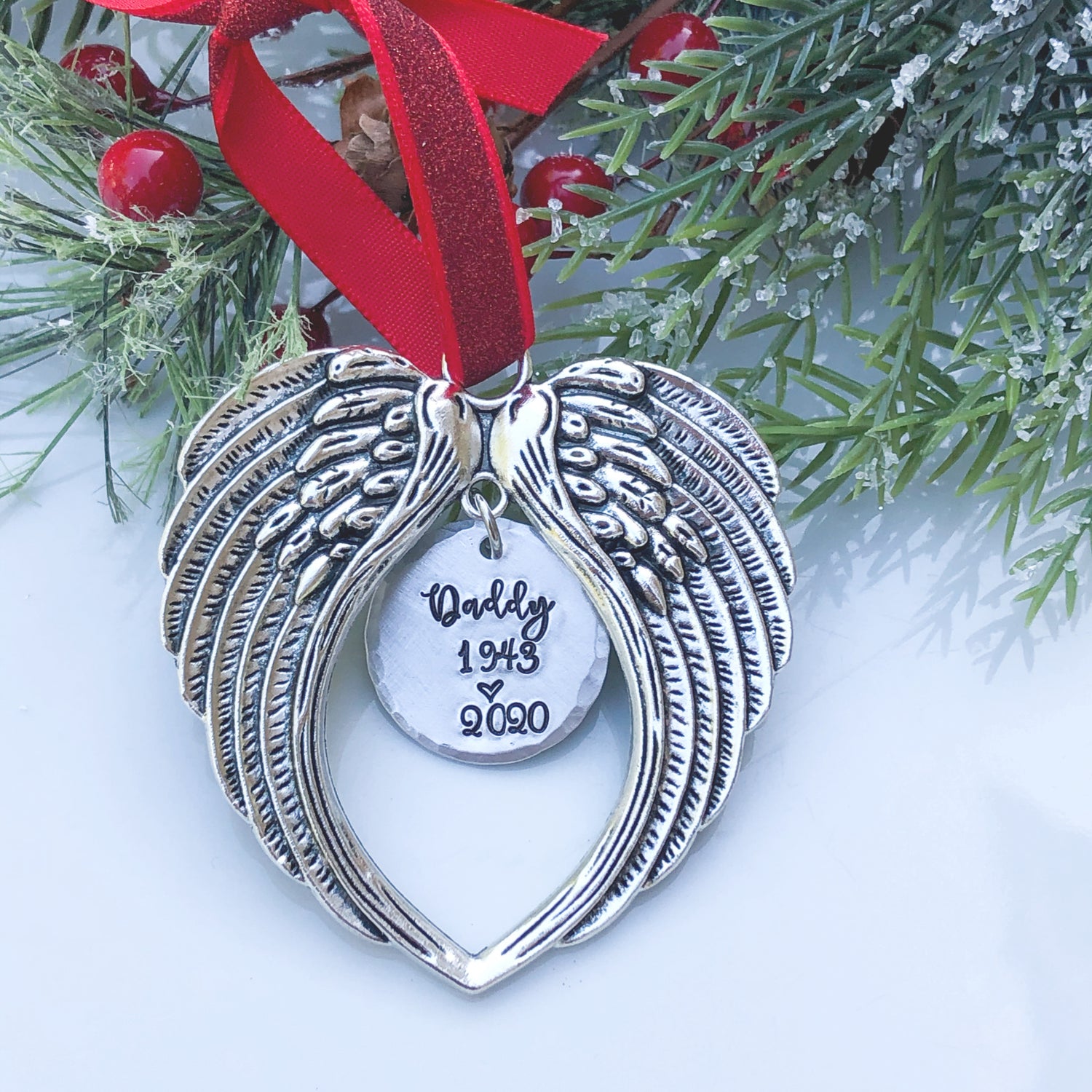 Commemorate the life of your loved one with this beautifully hand stamped Christmas tree ornament. Large silver angel wings surround and aluminum disc personalized with your loved one's name and years of life/death. Edge of disc is lightly hammered.