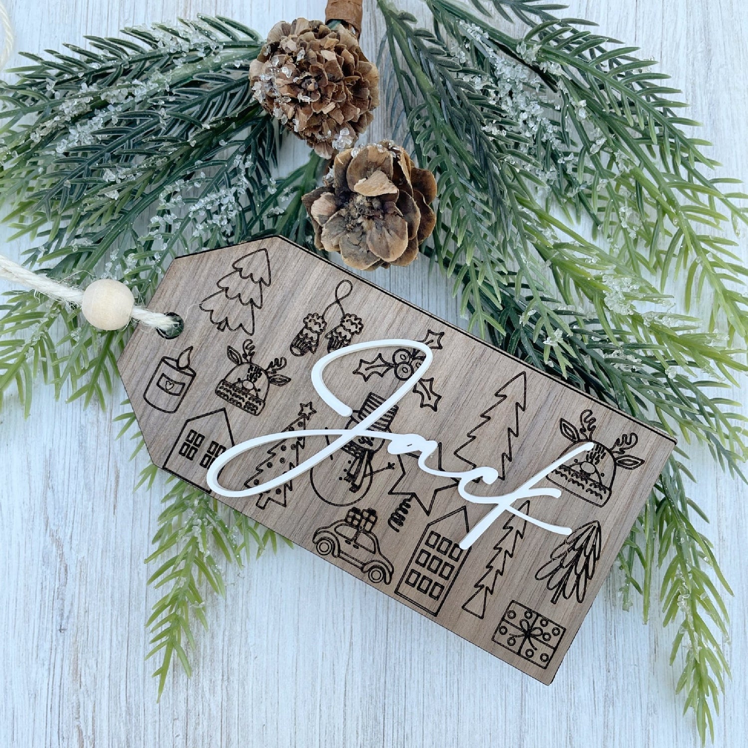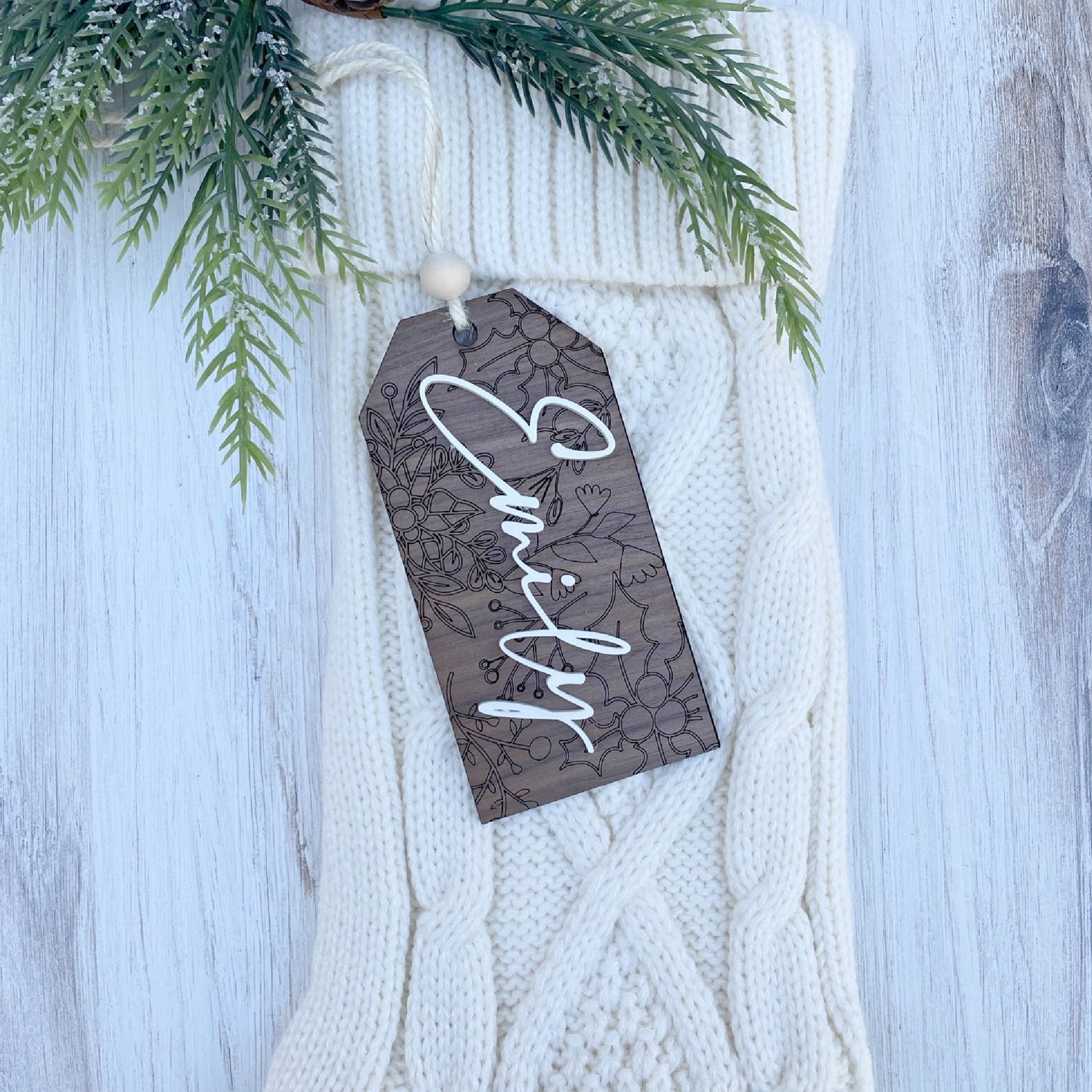 Add a personal touch to your holiday stockings with our custom stocking name tags. Cut from walnut wood and laser engraved with your choice of design, the tag is topped with white acrylic in the name of your choice.