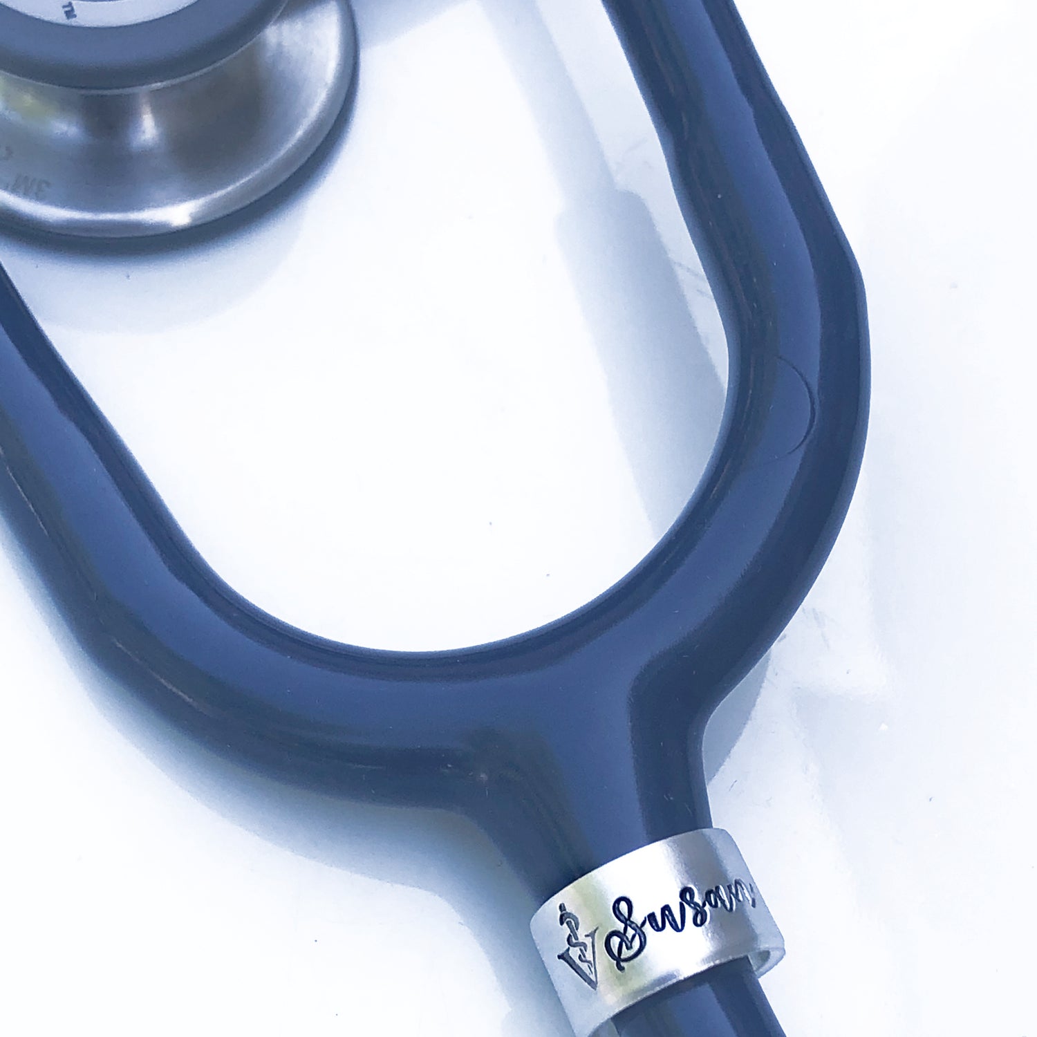 This stethoscope id tag makes the perfect gift for yourself or your favorite healthcare professional. Carefully crafted just for you out of your choice of the highest quality aluminum, brass, copper or sterling silver. These 3/8" wide, single wrap tags are are handcrafted and hand adjustable to get the perfect fit on your stethoscope tubing. Choose your favorite font and design to make your piece truly your own.