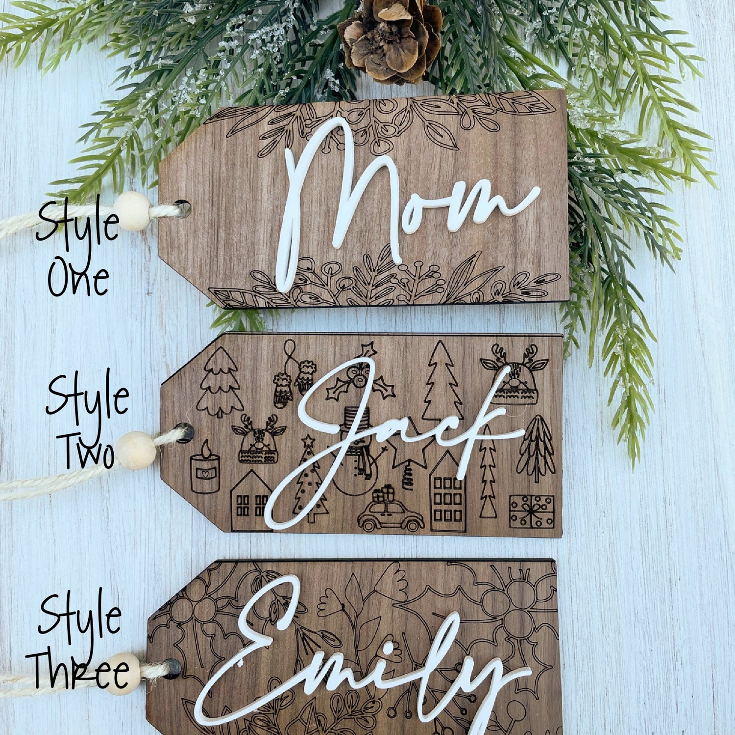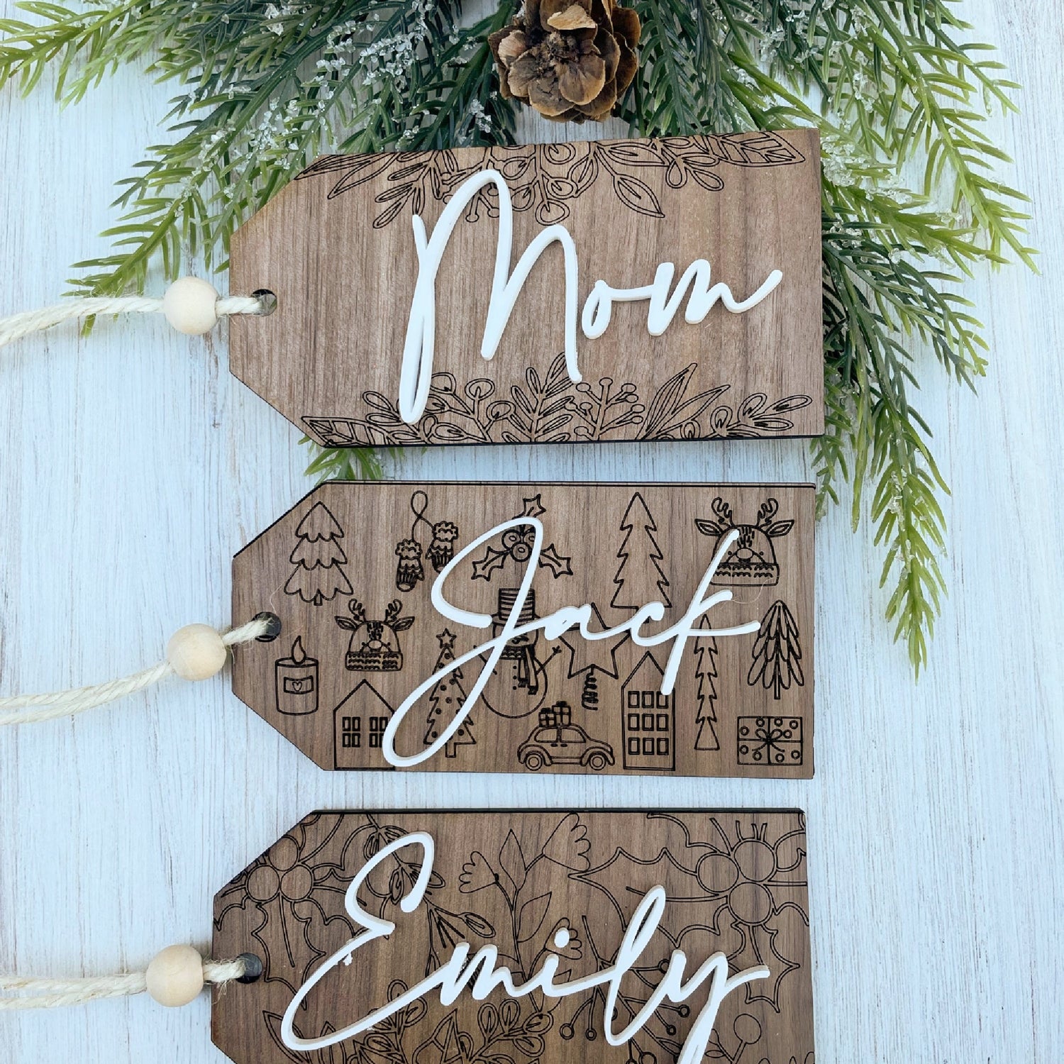 Add a personal touch to your holiday stockings with our custom stocking name tags. Cut from walnut wood and laser engraved with your choice of design, the tag is topped with white acrylic in the name of your choice.