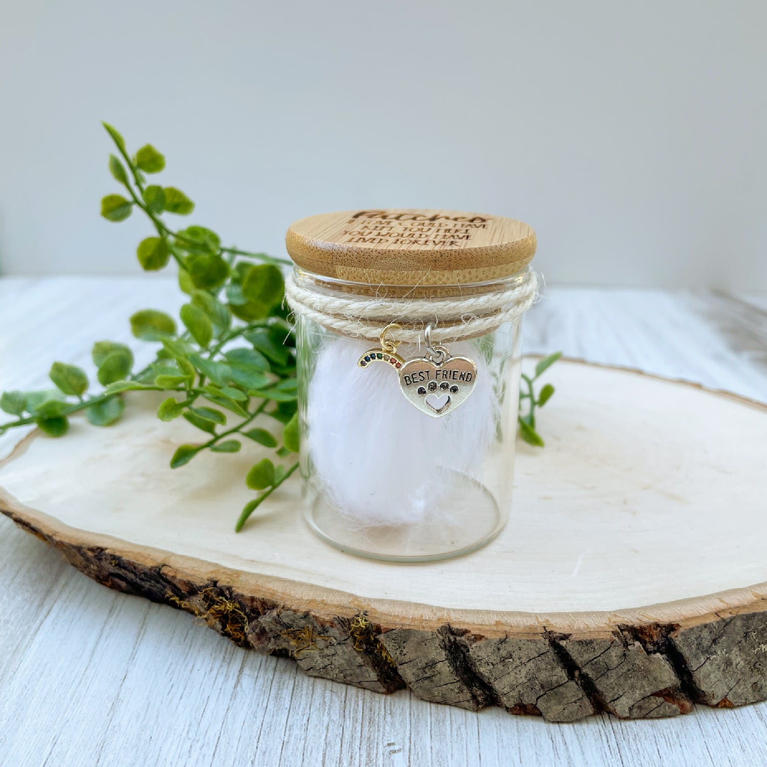 A pet's love knows no bounds, and their memory lives on in the hearts of those who cherished them. Our Pet Memorial Glass Jar is a touching way to honor your beloved companion by preserving a precious memento of their fur or ashes. Crafted with the utmost care, this glass jar provides a tangible connection to the enduring bond you shared.